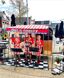 Op 5 mei stonden wij als The Andrews Sisters -voor ons vertrouwde Tabbertje- bij de allereerste High Liber Tea op het plein van Miluk in Harlingen.