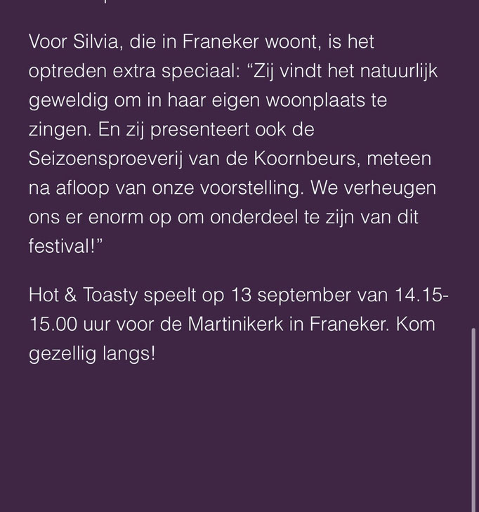Op zaterdagmiddag 13 september a.s. gaan wij weer los! We treden dan op voorafgaand aan de Seizoensproeverij van Theater De Koornbeurs in Franeker van 14.15 tot 15.00 uur. Speciaal voor dit optreden zijn we geïnterviewd. Zie foto's hieronder! Leuk weetje: de presentatrice van de Seizoensproeverij is onze Silvia.